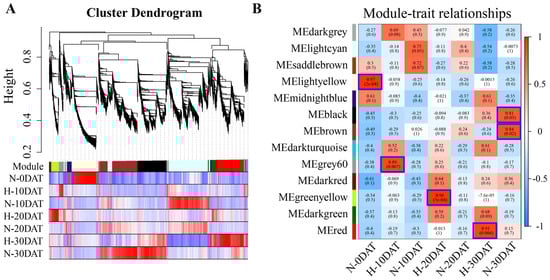 WGCNA of “XC-MU201” under various high-temperature conditions. (A) The hierarchical clustering tree illustrates the co-expression modules identified by WGCNA. (B) Module–trait relationships: Correlations between modules (left) and traits (bottom) are depicted. Positive correlations are shown in red, negative correlations in blue, and the correlation coefficients are provided. Parenthetical values indicate the corresponding p-values.