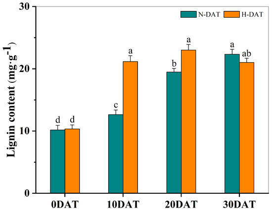 The total lignin content in XC-MU201 was analyzed under various treatment conditions, with the results graphically depicted using error bars to represent the Standard Error (SE) for three replicates (n = 3). The data are categorized by the duration of treatment: ‘N-DAT’ indicates days under normal conditions, and ‘H-DAT’ denotes days following high-temperature exposure. Statistical analysis revealed that differences in lignin levels, which are marked with the same letter, are not statistically significant (p < 0.05).