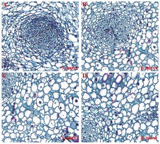 Wheat leaves from the ‘XC-MU201’ variety were subjected to four different treatments and subsequently stained with safranin. (A–D) Depict the staining outcomes for the N-20DAT, H-20DAT, N-30DAT, and H-30DAT treatments of XC-MU201, respectively, each at a magnification of 40×.