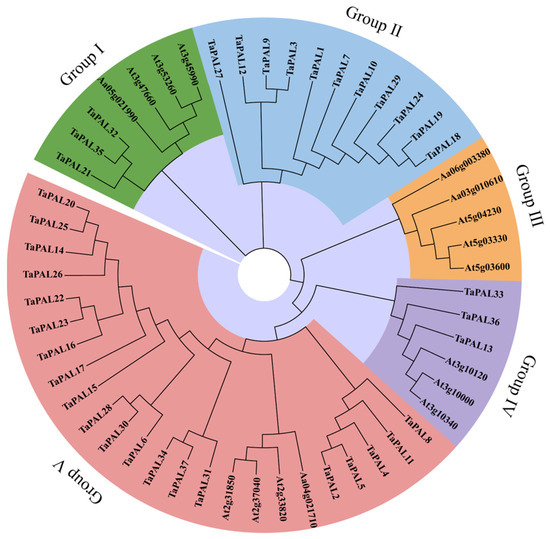 Phylogenetic analysis is a reliable method for elucidating the functions of wheat TaPAL proteins by examining their genetic history and sequence consistency among PAL members. This study constructed a phylogenetic tree comprising 37 wheat TaPALs and 16 Arabidopsis full-length PAL protein sequences (Figure 9). The topological structure of the tree was analyzed using the Maximum Likelihood (ML) method. Based on the existing classification of the PAL family in Arabidopsis [12], five distinct groups were identified: Groups I, II, III, IV, and V. Group V contained the largest number of genes, with 24 members. Subsequently, Group II, consisting solely of TaPALs, comprised 11 genes and formed a unique clade. In contrast, the genes in Group III originated exclusively from Arabidopsis. These findings highlight the significant evolutionary divergences between the PAL genes of wheat and those of Arabidopsis.