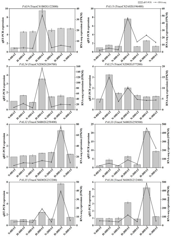 Quantitative real-time PCR analysis of eight TaPAL DEGs. The bar chart displays qRT-PCR data, and the line chart illustrates RNA-seq data. All data are presented as means ± SE.