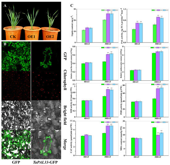 Furthermore, TaPAL33 was overexpressed in wheat cultivar “Xinchun 11”, cultivated in Xinjiang, resulting in the generation of more than 30 independent transgenic lines. Phenotypic evaluation of two transgenic lines, OE1 and OE2, which exhibited the highest levels of TaPAL33 expression, revealed significant growth inhibition (Figure 11A). This suggests a potential role for TaPAL33 in regulating cellular elongation. Further exploration of the protein’s cellular localization and function involved the fusion of its coding sequence with a GFP tag and subsequent transformation into tobacco leaves. Microscopic analysis showed that the TaPAL33–GFP fusion protein was predominantly localized in the cytoplasm and at the cell membrane (Figure 11B). Additionally, transgenic (OE) and wild-type (WT) lines underwent a 30-day treatment under both standard and high-temperature conditions. Subsequent physiological assessments demonstrated that even under normal conditions, the lignin content in OE lines exceeded that of the controls. With high-temperature exposure, lignin levels increased significantly across all lines, with the most pronounced increases observed in the OE lines (p < 0.01). PAL enzyme activity was significantly enhanced in the OE lines. After thermal stress, flavonoid concentrations in the leaves of OE lines were substantially higher than those in WT lines (p < 0.01), although differences in anthocyanin content between the lines were not statistically significant (p > 0.05). Moreover, overexpression of TaPAL33 significantly elevated the activities of antioxidant enzymes (SOD, POD, and CAT) and reduced the levels of malondialdehyde (MDA) in the leaves (Figure 11C). In summary, TaPAL33 plays a critical regulatory role in wheat development and thermotolerance by modulating lignin metabolism within the cell wall. These findings provide valuable insights into strategies to enhance wheat adaptability to high-temperature environments, underscoring the potential genetic targets for crop improvement.