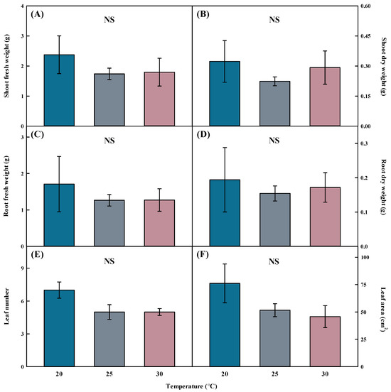Shoot fresh weight (A), shoot dry weight (B), root fresh weight (C), root dry weight (D), leaf number (E), and leaf area (F) by different temperatures of Aster × chusanensis (n = 5). Bar heights indicate the mean, and error bars show the mean standard deviation. Mean separation by Duncan’s multiple range test at 5% level. NS—difference not significant.