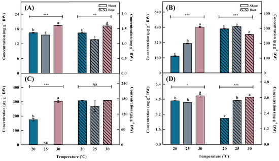 Individual phenolic acid concentrations by different temperatures for the shoots and roots of Aster × chusanensis (n = 8). (A) Chlorgenic acid, (B) p-hydroxybenzoic acid, (C) vanilic acid, and (D) benzoic acid. Bar height indicates the mean, and error bars show the standard deviation. Mean separation by Duncan’s multiple range test at 5% level. Different letters (a–c) above the bar mean significant differences (*, p < 0.05; **, p < 0.01; ***, p < 0.001). ND—non-detection; NS—no significant difference.