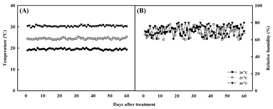 Using vegetative propagation, Aster × chusanensis individuals were separated from the mother plant, transplanted into a plastic pot containing horticultural soil (Tosilee, Yeast, Hapcheon-gun, Republic of Korea), and grown under different temperatures. Growth temperature conditions were 20 ± 2, 25 ± 2, and 30 ± 2 °C, as maintained using a growth chamber (VS-91G09M-4R, Visionbionex, Republic of Korea). Environmental conditions within the plant growth chamber were maintained at a relative humidity of 70 ± 10%, light intensity of 140 ± 10 μmol m−2 s−1, and a photoperiod of 12/12 h (day/night). Growth temperature and relative humidity were monitored at 2 h intervals during the experiment (Figure 6). After transplantation, the plants were irrigated for 1 week using distilled water and thereafter using Hoagland’s solution (electrical conductivity 1.2 dS m−1 and pH 6.0 at 24.2 °C) once per week. The plants were harvested after cultivation under these conditions for approximately 2 months.