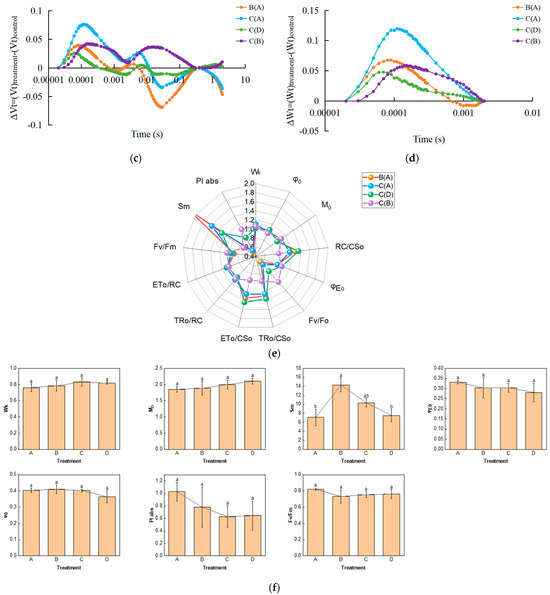 Kinetic characterization of OJIP transients in leaves of the R. chrysanthum following UV-B stress. (a) Fast chlorophyll fluorescence-induced kinetic curves; (b) O-point standardization; (c) Difference ΔVt curve between treatment and control Vt curves: orange and blue curves are for treatment A as control, green curves are for treatment D as control, purple curves are for treatment B as control; (d) Difference ΔWt curve between treatment and control Wt curves: orange and blue curves are for treatment A as control, green curves are for treatment D as control, purple curves are for treatment B as control; (e) Radar chart of fast chlorophyll fluorescence parameters; (f) Fluorescence parameters associated with PSII. Small letters a and b indicate significant differences (p < 0.05). Values are means ± S.E. (n = 3) based on analyses by one-way ANOVAs followed by LSD test. A: control; B: UV-B treatment; C: UV-B + ABA treatment; D: ABA treatment.