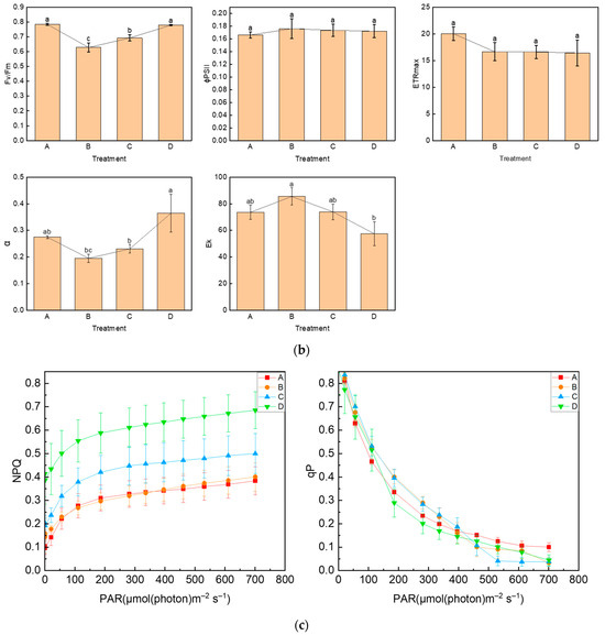 To reflect the use of energy absorbed by photosystem II, we analyzed the curves of NPQ and qP with light intensity, as shown in Figure 2c. The NPQ curves reflected the ability of plants to dissipate excess light energy into heat, and it was found that the trends of the curves were consistent in different treatments, and the photoprotective ability of leaves increased with the increase in light intensity. In the unapplied ABA treatment group, the photoprotective ability of leaves did not change significantly after the application of UV-B stress. In the treatment group with pre-applied ABA, UV-B stress was able to reduce the photoprotective ability of leaves. The qP curve indicates the proportion of energy absorbed by photosystem II used to carry out photochemical reactions, which can reflect the level of photosynthetic activity. It can be observed from the curve that the photosynthetic activity of leaves decreased with increasing light intensity, and when PAR was 700 µmol (photon) m−2 s−1, the photosynthetic activity of the treatment group with UV-B stress applied was significantly lower than that of group A, which was irradiated by natural light only. Detection of chlorophyll fluorescence parameters using the Imaging-PAM chlorophyll fluorescence imaging system showed that Fv/Fm, α, and Ek clearly reflected the effects of different treatments on photosynthesis, UV-B stress reduced photosynthesis, and ABA alleviated the effects of UV-B stress on plant photosynthesis, which was consistent with the results of OJIP curves. Each photosynthetic parameter and its biological significance are shown in Table 1.