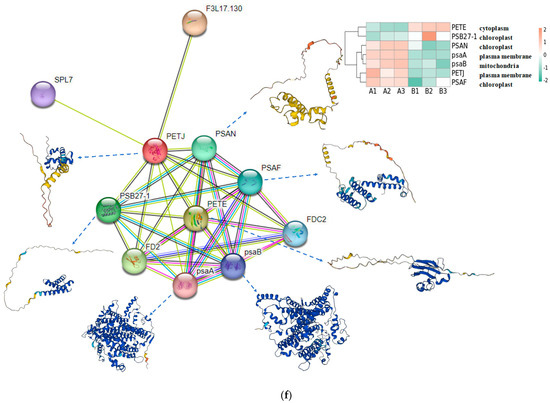 PETJ associated with photosynthesis was significantly altered in leaves of R. chrysanthum after UV-B stress. (a) Heatmap of protein expression associated with photosystem II; (b) Heatmap of protein expression associated with photosynthetic electron transport and cytochrome b6f complex; (c) Heatmap of protein expression associated with photosystem I; (d) Heatmap of protein expression associated with ATP synthase; (e) Heatmap of protein expression associated with antenna proteins (proteins were identified as complex-related based on their KEGG annotation information); (f) Protein interaction networks associated with PETJ (PETJ: cytochrome c6, photosynthesis proteins). A: control; B: UV-B treatment; PETE: Plastocyanin minor isoform, chloroplastic; PSB27-1: Photosystem II repair protein PSB27-H1, chloroplastic; PSAN: Photosystem I reaction center subunit N, chloroplastic; psaA: Photosystem I P700 chlorophyll a apoprotein A1; psaB: Photosystem I P700 chlorophyll a apoprotein A2; PSAF: Photosystem I reaction center subunit III, chloroplastic.