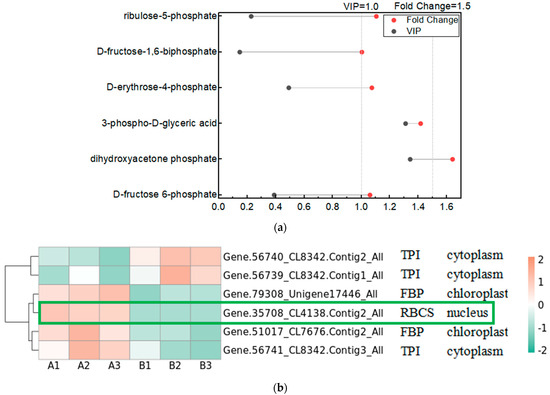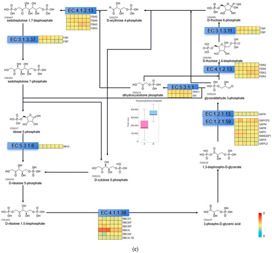 The Calvin cycle is an important reaction phase of plant photosynthesis, and we used metabolomics data to find the relevant metabolites in the pathway of the Calvin cycle, which are D-fructose 6-phosphate, dihydroxyacetone phosphate, 3-phospho-D-glyceric acid, D-erythrose-4-phosphate, D-fructose-1,6-biphosphate, and ribulose-5-phosphate. We used Variable Importance in Projection (VIP) greater than 1 and Fold Change (FC; experimental/control group) greater than 1.5 as the screening conditions, and screened the metabolite that changed significantly after UV-B stress as dihydroxyacetone phosphate, indicating that dihydroxyacetone phosphate is an important metabolite in the photosynthesis of R. chrysanthum in response to UV-B stress (Figure 4a). We used proteomics data to screen the enzymes regulated by light in the Calvin cycle of R. chrysanthum, and found that the enzymes related to the Calvin cycle in R. chrysanthum were triosephosphate isomerase (TPI), fructose-1,6-bisphosphatase (FBP), and ribulose-1,5-bisphosphate carboxylase (RBCS). Using p less than 0.05, and the fold of differential expression greater than 1.2 or less than 0.83 as the screening conditions, we found that the expression of RBCS was significantly reduced after UV-B stress, suggesting that UV-B stress can influence the expression of RBCS to regulate the Calvin cycle, thus reducing photosynthesis (Figure 4b). We show the Calvin cycle metabolic pathway and demonstrate the expression of relevant enzymes (Table S2) in the pathway in Figure 4c, and because dihydroxyacetone phosphate is a metabolite that changes significantly after UV-B stress, we have highlighted the expression of this substance in the figure with a box-and-line plot.