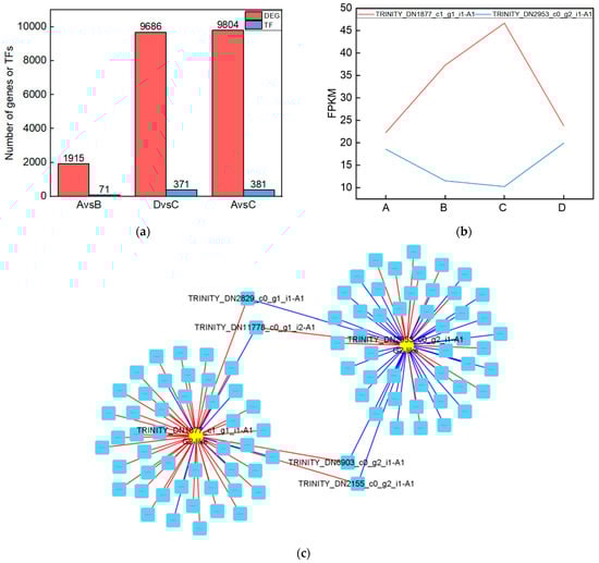 To investigate the genes that were significantly altered after UV-B stress, we performed transcriptomic assays on leaves of the R. chrysanthum. At Qvalue < 0.05, genes with FC > 1 are up-regulated differentially expressed genes (DEGs) and FC < 1 are down-regulated DEGs. The number of DEGs among the comparison groups is shown in the red part of Figure 5a. Information about the DEGs in the Calvin cycle pathway in the AvsB group is shown in Table 2. We annotated the DEGs in each comparison group with transcription factors and counted the number of transcription factors as shown in the blue part of Figure 5a. As G2-like TFs play a role in regulating photosynthesis, this study screened the G2-like transcription factors in each comparison group, and the information is shown in Table 3. It was found that two members of G2-like were significantly altered after UV-B stress with or without the involvement of ABA. The line graphs of the expression of these two genes are shown in Figure 5b, and it was found that the expression patterns of these two genes were opposite. We predicted the binding sites for these two TFs as shown in Table S3. We correlated these two genes with the remaining 1913 DEGs after UV-B stress and screened the respective top fifty genes to draw a correlation network diagram (Figure 5c). The results revealed that TRINITY_DN2829_c0_g1_i1-A1, TRINITY_DN11778_c0_g1_i2-A1, TRINITY_DN6903_c0_g2_i1-A1, and TRINITY_DN2155_c0_g2_i1-A1 were highly correlated with these two G2-like TFs, and their expressions are shown in bar graphs (Figure 5d). These four genes may be the key genes in the response of R. chrysanthum leaves to UV-B stress in photosynthesis.
