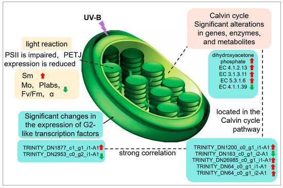 It was found that UV-B stress was able to impair the photosynthetic system of R. chrysanthum. UV-B stress resulted in altered expression of photosystem-associated proteins, with a significant decrease in Gene.18195_CL1537.Contig1_All. The expression of enzymes associated with the Calvin cycle and genes encoding the enzymes was significantly altered, and the amount of dihydroxyacetone phosphate was significantly increased. Altered expression patterns of two members of the family of transcription factors annotated as G2-like; significant differences in the expression of genes related to photosynthesis. G2-like TFs can influence gene expression in chloroplasts affecting photosynthesis in R. chrysanthum in response to UV-B stress (Figure 7).