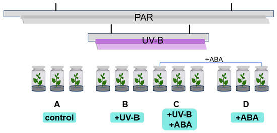 The R. chrysanthum group seedlings were treated with radiation as shown in Figure 8. Groups A and D received PAR (wavelength 400–700 nm) irradiation, and Groups B and C received PAR + UV-B (280–315 nm) irradiation, and filters were placed on the culture flasks, which were wrapped in tinfoil and labeled. The fluorescent lamps and filters required for the experiment were the same as those of the previous experiment [8]. The effective irradiance of the samples was 50 µmol (photons) m−2 s−1 and 2.3 Wm−2 for PAR and UV-B, respectively, measured using the UV intensity meter (Sentry Optron-ICS Corp., ST-513, SHH, New Taipei City, China) and a light meter (TES Electrical Electronic Corp., Tes-1339 Light Meter Pro., Taipei, China). After UV-B radiation for 2 days (8 h/day), chlorophyll fluorescence was detected in the histocultured seedlings, and the leaves were collected and placed in liquid nitrogen for the subsequent multi-histology detection.