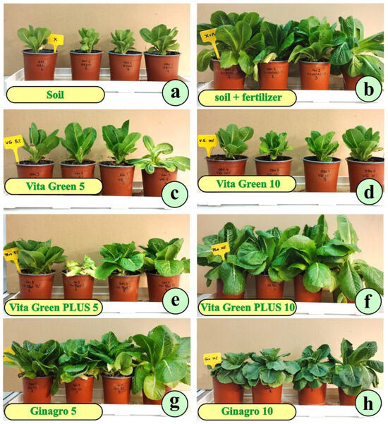 Plants from the eight culture groups, after the end of the culture period. The labels, lower left in each picture, indicate the composition of the culture substrate. (a) lettuce plants cultured in plain soil; (b) plants in soil +fertilizer; (c) plants cultured in soil amended with Vita Green 5%; (d) plants cultured in soil amended with Vita Green 10%; (e) the culture substrate is soil amended with Vita Green + 5%; (f) the culture substrate is soil amended with Vita Green + 10%; (g) lettuce plants cultured in soil amended with Ginagro 5% and (h) plants in soil with Ginagro 10%.