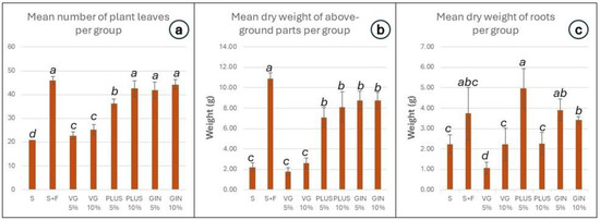 Concerning the productivity of the various culture treatments, we observed and recorded the following three parameters: (a) the number of the leaves; (b) the leaf biomass; and (c) the root biomass. All groups containing soil improvers demonstrated a statistically significant increase in the number of leaves per plant in comparison to plain soil (S). Three groups (PLUS 10%, GIN 5%, and GIN 10%) had a leaf number per plant that is close to that of the fertilized soil (S + F) (Figure 2a). In terms of leaf dry biomass, all PLUS and GIN groups had greater biomass than that of the plants grown in plain soil (Figure 2b), while the plants grown in fertilized soil exhibited a statistically significant increase in biomass compared to all other groups. The dry biomass of the roots increased in the groups of PLUS 5%, GIN 5%, GIN 10%, and S + F, a characteristic that is desirable in water deficiency conditions. The groups of PLUS 10% and VG 10% seemed to have no statistical difference compared to the S group, while plants grown in the VG 5% demonstrated a smaller root dry biomass compared to all other groups (Figure 2c).