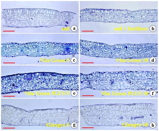 Cross-sections of epoxy embedded leaves from plants growing in (a) plain soil; (b) soil with conventional fertilizer; (c) Vita Green 5%; (d) Vita Green 10%; (e) Vita Green PLUS 5%; (f) Vita Green PLUS 10%; (g) Ginagro 5%; and (h) Ginagro 10%. Scale bars in all micrographs are 100 μm.