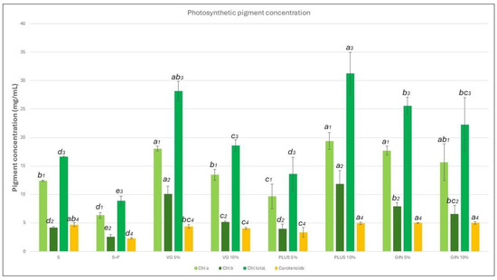 Bar graphs depicting the concentration of chlorophyll a (●), chlorophyll b (●), total chlorophylls (●), and carotenoids (●). Error bars represent the standard error of the mean; the results are grouped using the compact letter display (CLD) methodology; p values ≤ 0.05 were characterized as statistically significant.
