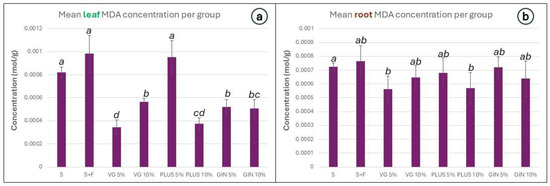 Bar graphs depicting measured MDA concentration in (a) the leaves and (b) the root of L. sativa. Error bars represent the standard error of the mean. The results are grouped using the compact letter display (CLD) methodology; p values ≤ 0.05 were characterized as statistically significant.