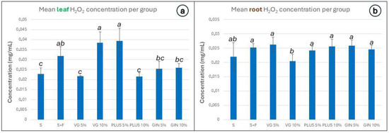 The concentration of H2O2 was higher in the leaves of the S + F, VG 10%, and PLUS 5% groups. The lowest concentration was observed again in the groups VG 5% and PLUS 10%. The roots of all groups seemed to have a similar amount of H2O2, with the VG 10% group presenting a slight decrease (Figure 8).