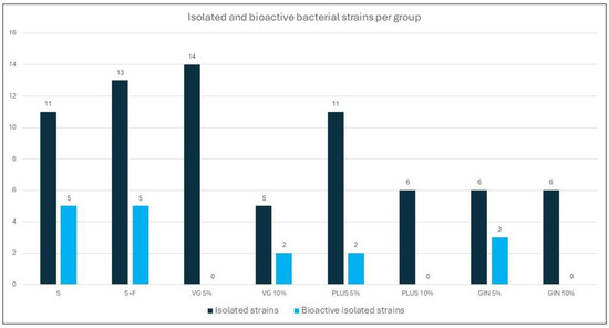 Seventeen out of seventy-two morphologically distinct bacterial strains isolated from the eight different soil samples of the experiment presented antimicrobial activity against at least one of the six indicator strains (Figure 9). As it is demonstrated, none of the strains isolated from the groups VG 5%, PLUS 10%, and GIN 10% had the ability to inhibit the growth of any microbial indicator.