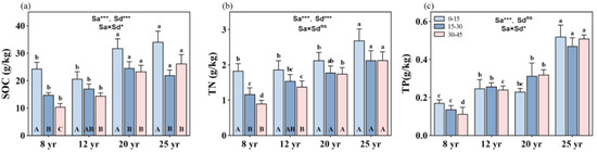 Variation in soil nutrient concentrations in the soil vertical profile across different stand ages of Chinese fir forests: (a) soil organic carbon (SOC), (b) soil total nitrogen (TN), and (c) total phosphorus (TP). Different lowercase letters indicate significant differences of soil nutrients at the same soil depth in different stand ages, while different uppercase letters indicate significant differences of soil nutrients in different soil depths at the same stand age. ** and *** denote p < 0.01 and p < 0.001, respectively, while “ns” indicates non-significance. “Sa” refers to stand age, and “Sd” refers to soil depth. Bars represent the mean ± standard error (n = 12).