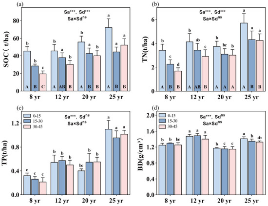 Distribution of SOC, TN, and TP storage and BD value in the soil vertical profile across different aged stands of Chinese fir forests: (a) SOC storage, (b) TN storage, (c) TP storage, and (d) BD value. Different lowercase letters indicate significant differences of soil nutrients at the same soil depth in different stand ages, while different uppercase letters indicate significant differences of soil nutrients in different soil depths at the same stand age. ** and *** denote p < 0.01 and p < 0.001, respectively, while “ns” indicates non-significance. “Sa” refers to stand age, and “Sd” refers to soil depth. Bars represent the mean ± standard error (n = 12).