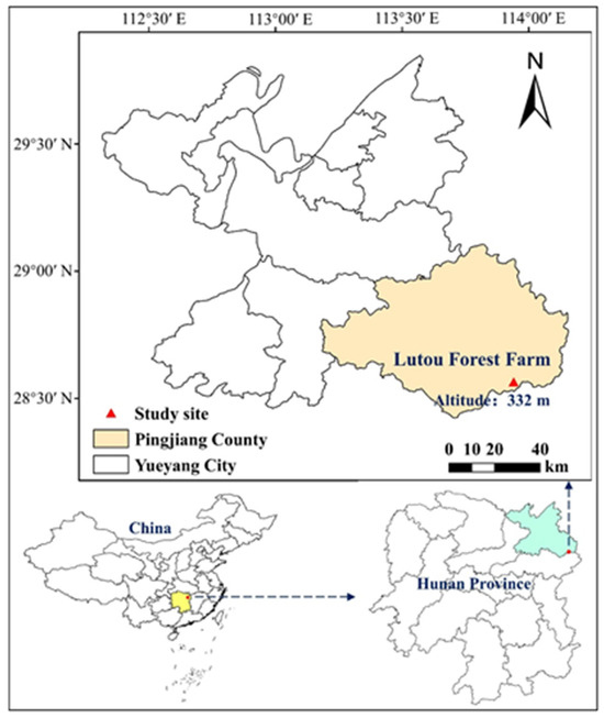 The study site is located at Lutou Forest Farm, Pingjiang County, Hunan Province, China.