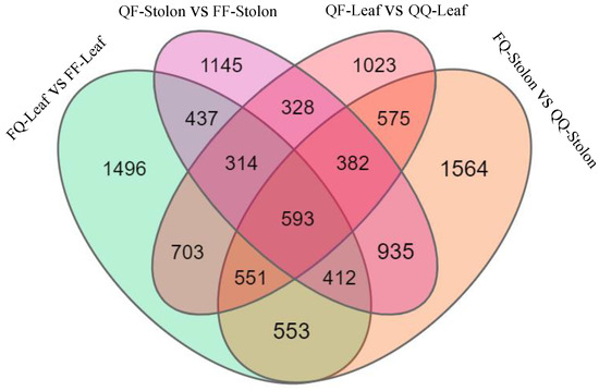 The transcriptome sequencing of the 24 samples of leaves and stolons from heterologous (FQ, QF) and self-grafted (QQ, FF) plants was used to determine the DEGs involved in regulating tuber formation induced by grafting in early- and late-maturing varieties. The screening criteria were log2 (fold change) ≥ 0 and p < 0.5. The late-maturing variety Q exhibited 1496 genes in its rootstock leaves and 1145 genes in its scion creeping stem. The early-maturing variety F exhibited 1023 genes in its rootstock leaves and 1564 genes in its scion creeping stem. A total of 593 genes were upregulated in QF-leaf vs. QQ-leaf, FQ-stolon vs. QQ-stolon, FQ-leaf vs. FF-leaf, and QF-stolon vs. FF-stolon (Figure 2).
