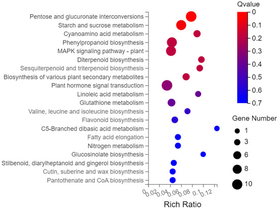 Gene ontology (GO) analysis was performed on the 593 screened DEGs (Figure 3). There were significant enrichments in 17 biological processes, 13 cellular components, and 8 molecular functions. Cellular processes and metabolic processes showed the highest degree of enrichment among the biological processes (110 genes each). The most enriched cellular component genes were related to cells (123), cell components (123), membranes (82), and organelles (77). The most enriched major molecular functions were catalytic activity (126 genes), binding (109), molecular function regulator (22), and transcription regulator activity (22). The Kyoto Encyclopedia of Genes and Genomes (KEGG) pathway analysis of the 593 DEGs showed enrichment predominantly in the interconversion of pentose and glucuronic acid, starch and sucrose metabolism, phenylpropanoid biosynthesis, plant hormone signal transduction, and plant MAPK signaling pathways, in addition to other pathways (Figure 4).