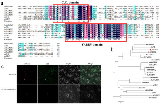 StYABBY1 gene sequence analysis and subcellular localization. (a) Multiple sequence alignment of StYABBY1 and Arabidopsis StYABBY proteins; (b) phylogenetic tree of StYABBY1 and YABBY1 proteins in other species; and (c) subcellular localization of StYABBY1 protein in tobacco (Nicotiana benthamiana) epidermal cells.