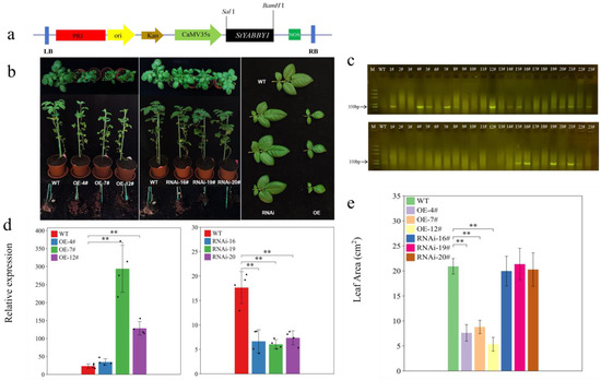 Effects of overexpressing StYABBY1 on the leaves of potato plants. (a) Schematic diagram of pRI101-StYABBY1 vector; (b) phenotypes of overexpression and RNAi transgenic plants at 60 d; (c) screening for kanamycin resistance by PCR electrophoresis; (d) relative expression of StYABBY1 gene in transgenic plants; and (e) leaf area of transgenic plants.Note: # Number suffix, ** (p < 0.05).