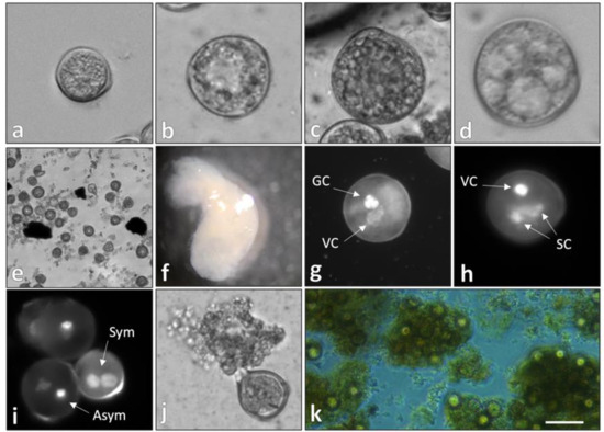 In vitro development of temperature-stressed soybean microspores. (a–c) Microgametogenesis, denoted by cell enlargement and the presence of starch granules; (d–f) microspore embryogenesis in soybean. (d) Embryogenic microspore with evident cytoskeletal fibers fragmenting the cytoplasm; (e) rapidly dividing pro-embryo; (f) microspore-derived embryo with established polarity; (g,h) pollen mitosis 1 (g) and 2 (h) observed in noninduced microspores; (i–k) cytological markers associated with an embryogenic culture. (i) Symmetrical division during pollen mitosis 1 observed via DAPI staining; (j,k) secretion of intrinsic molecules from nonisodiametric cells into the induction medium, forming a matrix. VC = vegetative cell; GC = generative cell; SC = sperm cell; Sym = symmetrical mitotic division; Asym = asymmetrical mitotic division. (a–c) bars = 15 μm; (d) 5 μm; (e) 100 μm; (f) 1 mm; (g,h) 10 μm; (i,j) 15 μm; (k) 100 μm.