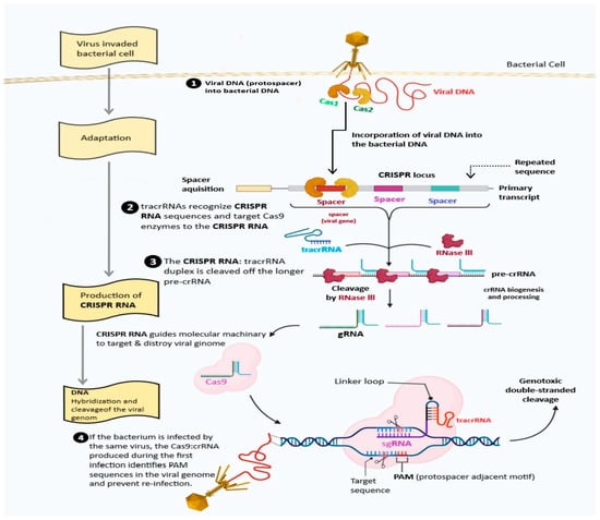 Different groups of bacteria and many Archaea use different CRISPR systems to defend themselves against foreign nucleic acids, such as viruses and plasmids. The taxonomic distribution of the major classes of CRISPR-Cas systems in different groups of bacteria and Archaea have been well documented to show the distribution of different Cas proteins in these organisms [18]. The CRISPR-Cas system could be explained to act in three stages: adaptation, expression, and interference. Briefly, following the infection by the viruses, the bacterial host genome’s CRISPR repeat sequences are decoded as arrays, and type II CRISPR systems integrate sequences from overrunning DNA between them. The CRISPR reprise arrays are repeated to form crRNA, each containing a different sequence taken from the DNA it overlaps, called the “protospacer” sequence. This sequence makes up a part of the CRISPR reprise. In the type II system, the trans-activating crRNA (tracrRNA), an alternative RNA, hybridizes with each crRNA, forming a complex with the Cas9 nuclease. Only when PAMs are located conterminous to the protospacer-decoded portion of the crRNA will Cas9 be directed to stick reciprocal target-DNA sequences to make breaks in the DNA [19]. A detailed classification of these CRISPR-Cas systems and Cas proteins would provide valuable information for modifying and adapting them for various applications.