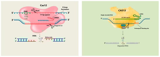 Cas12f, a protein in the CRISPR-Cas framework, has been characterized for its unique biochemical properties. This protein originated in extreme thermophiles and shows high affinity to single-stranded DNA (ssDNA) without the requirement of a PAM sequence for its activity [27] (Figure 3). The CRISPR/Cas12f system has been used to detect and genotype single-nucleotide polymorphisms (SNPs) and improve resistance to ssDNA viruses in crops [65]. Cas12f protein offers several advantages over the traditional Cas9 protein. For example, Cas12f is incredibly small, with only 500 amino acids, and hence could be delivered to any target organism more efficiently than the Cas9 protein (Table 4 and Table 5). Moreover, Cas12f-based biosensors (HARRY) are receiving more focus than others like Cas12 and Cas13 proteins because of their improved sensitivity in the detection of diverse targets [66].