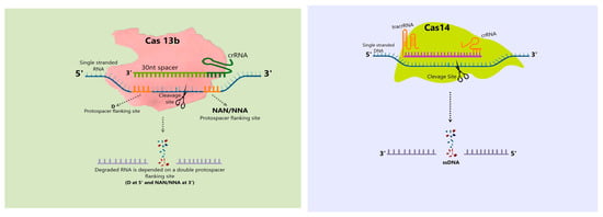 Cas proteins are an essential component of CRISPR systems and their varied abilities to edit DNA or RNA make them a potential tool in genome editing. Cas proteins, including Cas9, Cas12, Cas13, and Cas14, have been exploited for genetic engineering [7] and are discussed further below (Table 2 and Table 3).