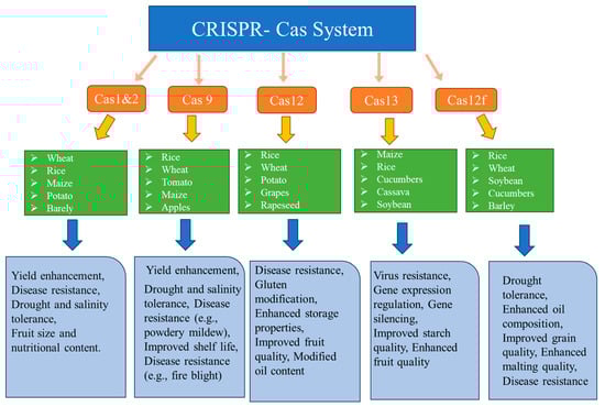The CRISPR-Cas system has been divided into two main categories and several subtypes based on the complexity of the effector proteins, genomic location, pre-crRNA processing and interference. The diversity of CRISPR-Cas has increased over the past years and the evolutionary classification of this system and Cas genes has been well documented by Makarova et al., 2019 [6]. In this review, we have discussed the two main classes of CRISPR-Cas system with focus on Cas proteins that have the potential for use in agriculture.