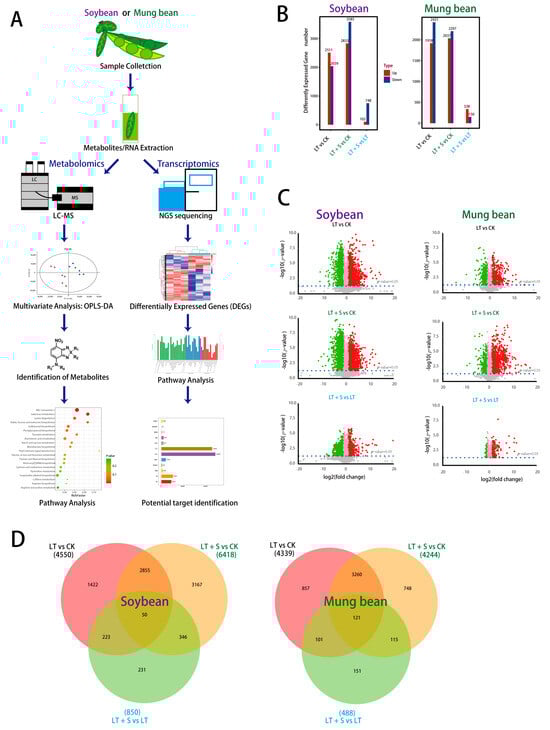 Workflow overview and comparative analysis of metabolome and transcriptome. (A) Transcriptomic and metabolic analysis schematic. (B) Quantitative overview of differentially expressed genes in soybean and mung bean. (C) Volcano plot highlighting up-regulated (in red) and down-regulated (in green) metabolites. (D) Venn diagram illustrating the overlap and differences in gene expression between various treatments in soybean and mung bean. CK represents the control group sprayed with water and planted under normal temperature, LT represents the group sprayed with distilled water and planted under low temperature, LT + S represents the group sprayed with uniconazole S3307 and planted under low temperature.
