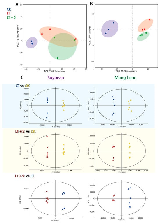 Principal component analysis (PCA) of soybean and mung bean response to various treatments. (A) PCA analysis of soybean transcriptomic profiles. (B) PCA analysis of mung bean transcriptomic profiles. (C) PCA analysis of metabolome expression profiles in soybeans and mung beans. CK represents a control group treated neither with chemical treatment nor cold stress, LT represents the group treated with cold stress without uniconazole S3307, and LT + S represents the group treated with uniconazole S3307 followed by cold stress.
