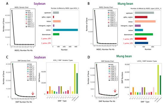 Comparative analysis of genetic variations and phylogeny in Asian beans. (A) INDEL events in soybean, (B) INDEL events in mung bean, (C) SNP occurrences in soybean, and (D) SNP occurrences in mung bean. The red arrows in Figure 4C,D point to the location where there is a significant difference in SNP density between soybean and mung bean.