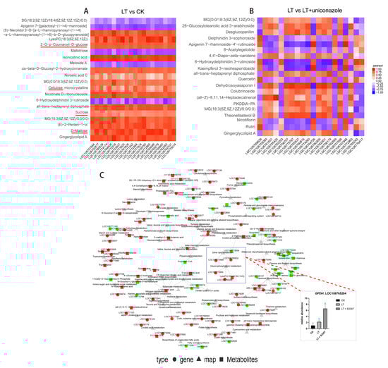 Interactive transcriptomic and metabolomic analysis in mung bean. (A) and (B) Pearson correlation test of top 20 metabolites and transcripts under different treatments. The sugar-related metabolites are underlined with red color in panel A. (C) KGML network analysis under low-temperature stress and uniconazole treatment with RT-qPCR validation of GPDH expression. CK represents a control group treated neither with chemical treatment nor cold stress, LT represents a group treated with cold stress without uniconazole S3307, and LT + uniconazole represents a group treated with uniconazole S3307 followed by cold stress. Different letters on the bar chart indicate significant differences among treatments (p < 0.05, Duncan’s multiple range test).