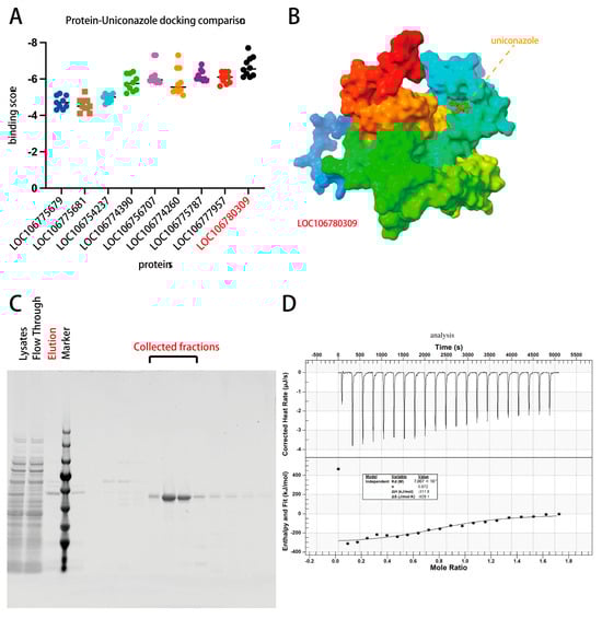 Assessment of uniconazole binding to photosynthesis-related genes. (A) Docking scores for uniconazole across photosynthesis-enriched gene sites. (B) Predicted binding site of uniconazole on LOC106777957. (C) Protein purification of LOC106777957. (D) Isothermal titration calorimetry (ITC) analysis of recombinant LOC106777957 interaction with uniconazole.