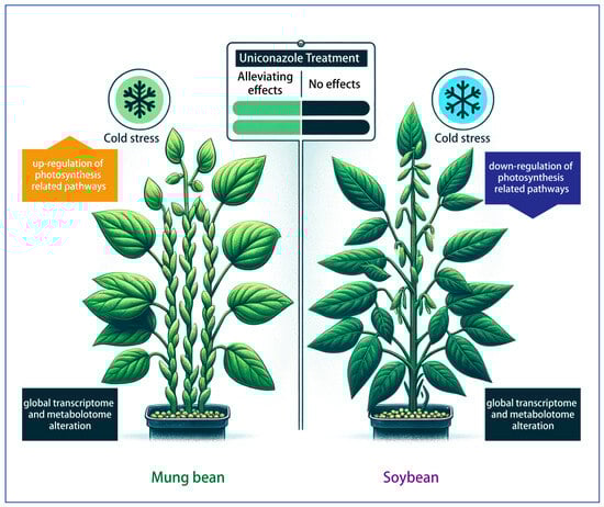 The detrimental effects of cold stress on legume crops underscore the urgency to understand and improve plant tolerance mechanisms [47,48]. Legumes are pivotal for global nutrition and ecological sustainability, yet their productivity is compromised in the face of chilling temperatures. Current research has not fully unraveled the complex responses of these plants to cold stress, a gap attributed to the diverse cultivation environments and the distinct thermal adaptation strategies they exhibit [1,49]. This study’s comparative analysis of soybean and mung bean responses aims to illuminate these complexities. By integrating molecular, biochemical, and physiological data, it becomes evident that each legume species possesses a unique cold stress response signature. The findings particularly highlight how the application of uniconazole, a plant growth regulator, differentially influences their stress pathways, potentially offering a new avenue for enhancing cold tolerance in mung bean. It is posited that understanding these differential responses is crucial for designing targeted interventions, which could include selective breeding programs or agronomic practices tailored to bolster the inherent resilience of these legumes. Such strategies are imperative for safeguarding crop yields and ensuring the nutritional security that legumes provide, particularly in regions where climate change threatens traditional agricultural practices.