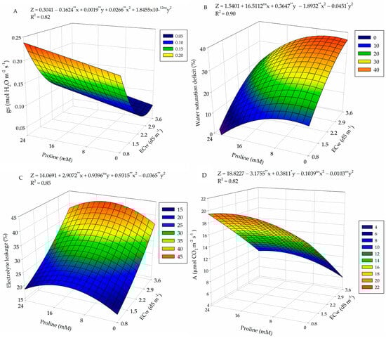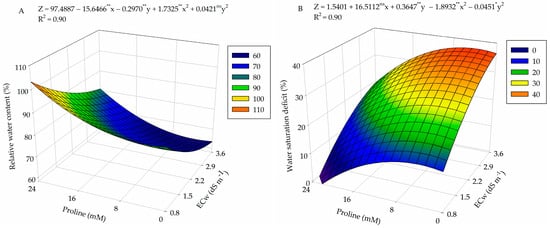 Foliar application of proline mitigated the effect of salt stress on the relative water content (RWC) in the leaf blade, with the highest estimated value (100%) obtained in plants subjected to ECw of 0.8 dS m−1 and a proline concentration of 24 mM (Figure 1A). In contrast, the lowest value (63.6%) occurred in plants cultivated under an estimated water salinity of 3.0 dS m−1 and that did not receive foliar application of proline.