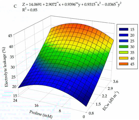 Electrolyte leakage (EL%) in the leaf blade of guava increased with the increase in irrigation water salinity, with the highest value (42.6%) reached in plants subjected to ECw of 3.6 dS m−1 and under a proline concentration of 13.5 mM (Figure 1C). Conversely, the lowest EL% value (17%) occurred in plants cultivated under the lowest ECw level (0.8 dS m−1) and in plants that did not receive foliar application of proline (0 mM), indicating that the increase in salt stress promoted a 25.6% increase when comparing the maximum value obtained at ECw of 3.6 dS m−1 to that obtained at the lowest salinity level (0.8 dS m−1).