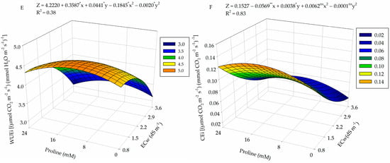 For instantaneous carboxylation efficiency (Figure 2F), the electrical conductivity of water of 0.8 dS m−1 and an estimated proline concentration of 13.5 mM resulted in a maximum value of 0.13 [(μmol CO2 m−2 s−1) (μmol CO2 m−2 s−1)−1]. The minimum value of 0.02 [(μmol CO2 m−2 s−1) (μmol CO2 m−2 s−1)−1] was found in plants without proline application (0 mM) and under ECw of 3.6 dS m−1.