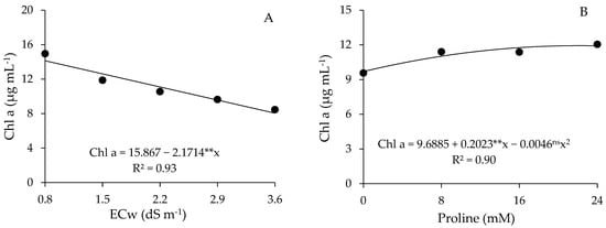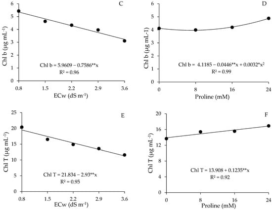 Contents of chlorophyll a (Chl a), chlorophyll b (Chl b), and total chlorophyll (Chl T) of guava plants cv. Paluma as a function of the levels of electrical conductivity of the water (ECw) (A,C,E) and proline concentrations (B,D,F) at 360 days after transplanting. ** and * significant at p ≤ 0.01 and p ≤ 0.05 and ns not significant (p > 0.05) according to the F test, respectively.