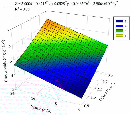 Carotenoid content of guava plants as a function of the interaction between levels of electrical conductivity of water (ECw) and proline concentrations at 360 days after transplanting. X and Y: levels of electrical conductivity of water (ECw) and proline concentrations, respectively; ** and * significant at p ≤ 0.01 and p ≤ 0.05 and ns not significant (p > 0.05) according to the F test, respectively.