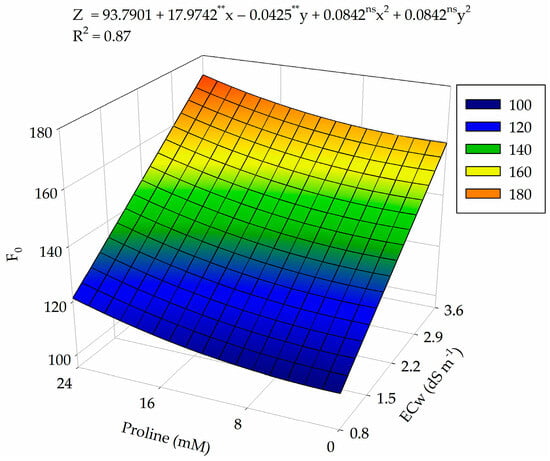 For the initial fluorescence (F0), the increase in water salinity and proline concentrations promoted an increase in F0 (Figure 5), with the highest value (172.66) obtained in plants irrigated with ECw of 3.6 dS m−1 and under 24 mM of proline. On the other hand, the lowest value (108.21) of F0 occurred in plants subjected to water salinity of 0.8 dS m−1 and a proline concentration of 1.5 mM. When comparing the maximum and minimum values obtained, an increase of 37.3% in the initial fluorescence was observed when plants were subjected to ECw of 3.6 dS m−1 and a proline concentration of 24 mM.