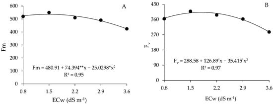 Maximum fluorescence (Fm) showed a quadratic behavior, and the maximum estimated value (536.18) occurred in plants irrigated with 1.5 dS m−1 water, decreasing from this salinity level and reaching the lowest value (424.34) under ECw of 3.6 dS m−1 (Figure 6A). When comparing the Fm of plants subjected to the highest salinity (3.6 dS m−1) to the value of those cultivated under ECw of 0.8 dS m−1, a reduction of 20.85% was observed.