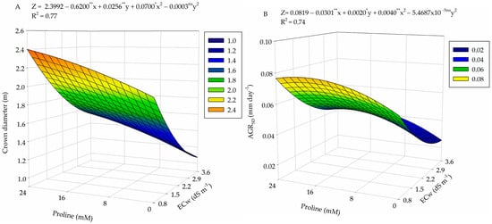 For the absolute growth rate in stem diameter (AGRSD) (Figure 7B), it was observed that irrigation with ECw of 0.8 dS m−1 associated with foliar application of proline at the estimated concentration of 18 mM resulted in the highest values (0.0784 mm day−1). When comparing the AGRSD of plants that did not receive foliar application of proline and were irrigated with water of 0.8 dS m−1, whose estimated value was 0.0603, an increase of 23.08% was observed. Meanwhile, plants that did not receive foliar application of proline and were irrigated with ECw of 3.6 dS m−1 obtained the lowest value found (0.0253 mm day−1), which indicates a gain of 67.7% when compared with the maximum values obtained.