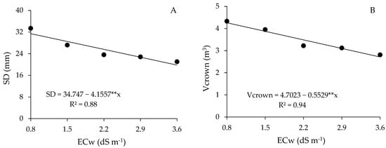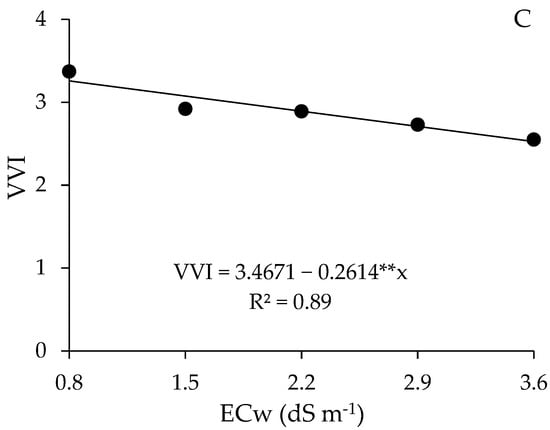 Stem diameter (SD) (A), crown volume (Vcrown) (B), and vegetative vigor index (VVI) (C) of guava plants cv. Paluma as a function of the levels of electrical conductivity of the water (ECw) at 190 days after transplanting. ** significant at p ≤ 0.01 according to the F test.